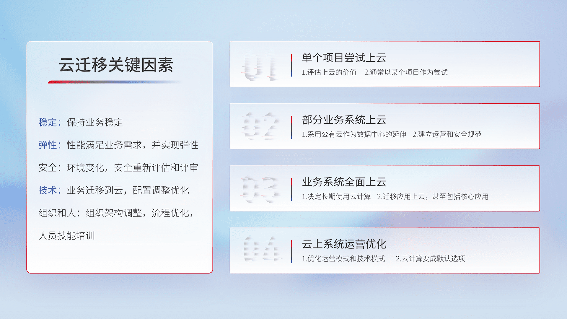 结合实际业务,,从规划设计、、、、云平台选型、、、、云原生改造、、、、数据迁移、、集成交付,,,,迁移全过程为客户识别最佳上云路径,,,,做好风险识别管理,,,,设计网络架构、、身份权限、、安全审计合规、、、、操作审计、、日志审计、、监控告警策略、、多站点容灾设计等,,对云上基础设施进行整体规划,,,,提升IT治理水平,,以满足弹性、、、高可用、、、、高性能的需求。。。