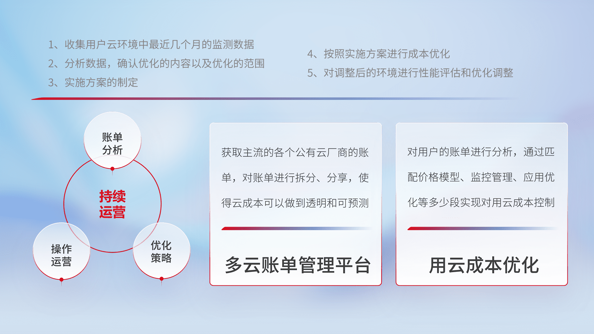 通过多云纳管,,,,以统一的资源数据模型把客户的云资源进行抽象和封装,,,进而实现对多云资源的统一操作,,,保障云资源管理的可靠性、、稳定性与可用性。。。。量身定制化运维内容,,,,配置、、开发运维、、补丁管理、、、备份、、监控、、、认证和访问管理、、审计和日常巡检等,,保障在用云过程中的可靠度,,稳定度以及高可用率。。